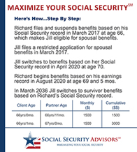 A full analysis of ALL your clients’ claiming options and a Maximum Social Security StrategySM tailored specifically for him/her.